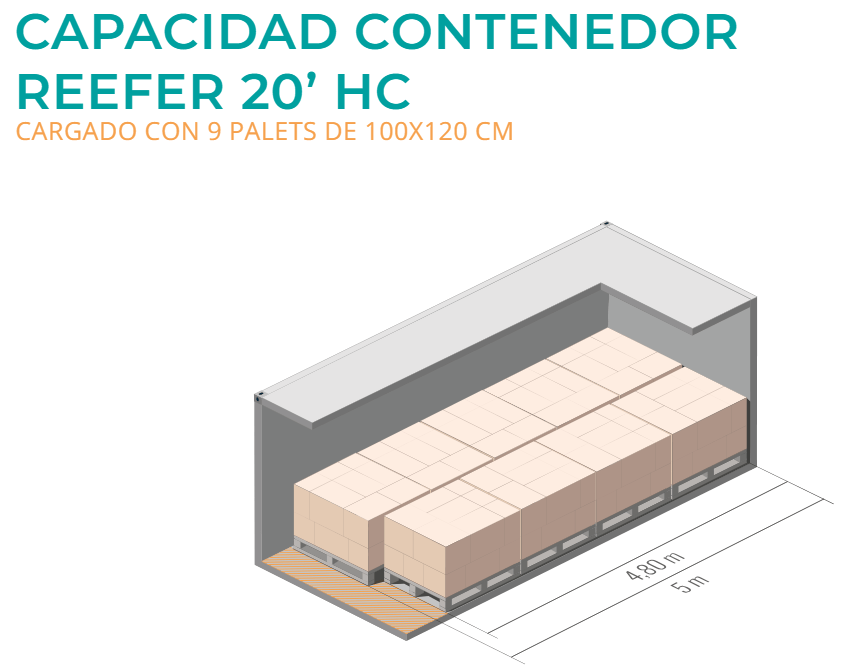 - Pallets estándar americanos (ISO pallets, 120 cm x 100 cm): 9 pallets