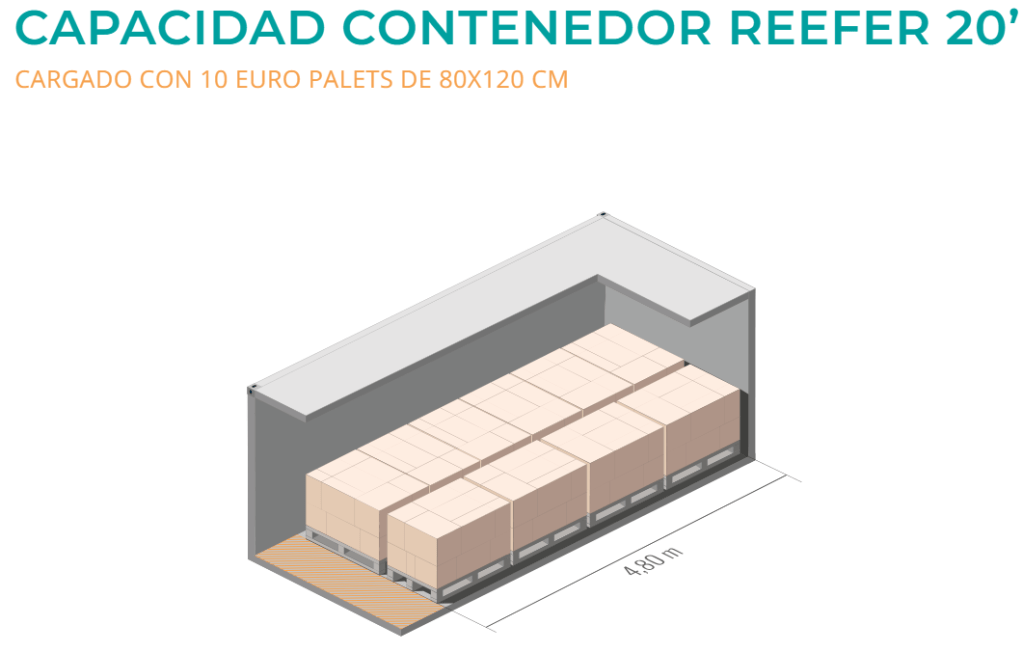 - Pallets estándar europeos (EURO pallets, 120 cm x 80 cm): 10 pallets